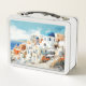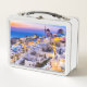 Bonita lonchera blanca para niños con dos fotos diferentes de Santorini, Grecia. Atardecer en el lugar más hermoso de Grecia.