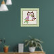 Búho tierno de primavera en una rama poster, con una linda lechuza primaveral en morado y marrón oscuro sosteniendo una flor en su pico (billete) en una rama y un borde de yeso verde. Un diseño adorable para los amantes de las lechuzas, perfecto para la decoración de las guarderías. Obra de arte de Trina Clark.