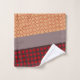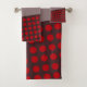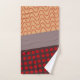 Este conjunto de toallas presenta un diseño moderno de mediados de siglo con líneas onduladas naranjas sobre un fondo dorado, círculos rojos sobre un fondo marrón y un fondo gris. Si quieres el mismo diseño con colores diferentes, envíame un mensaje.