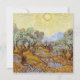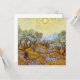 Olivos con cielo amarillo y sol. Vincent Willem van Gogh. Paisaje en tonos cálidos amarillos. Gran jardín con grandes árboles. Montañas en el fondo. Hay un sol grande y brillante en el cielo. Reproducción de famosas obras de arte imágenes de dominio público.