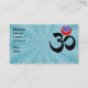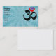 Producto: Tarjetas de visita de yoga — Diseño: símbolo exclusivo de om con luna creciente roja y loto rosa — Fondo:azul abstracto