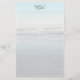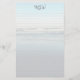 Papel de escritura personal monogramado y alineado. Una playa de arena clara tiene olas que llegan a la playa con marea baja. Las líneas de luz cubren el papel de la parte delantera con una plantilla para tres monogramas iniciales en la parte superior. En la parte trasera del periódico también se encuentra la playa.