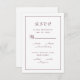 La tarjeta de respuesta de selección de comida para RSVP elegante presenta un diseño elegante con letra cursiva y caligrafía en burgundy romántico sobre un fondo blanco crujiente. La parte trasera de la tarjeta de respuesta es de color blanco sólido. Para obtener resultados óptimos, reemplace los detalles del modelo con sus propios detalles. Envíe un correo electrónico a invitationsuites@gmail.com con preguntas o solicitudes de colores personalizados. No dude en contactarme en invitationsuites@gmail.com si tiene preguntas sobre este o cualquiera de nuestros diseños.