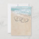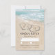 Tarjetas de respuesta de menú de boda en destino de playa con un fondo de isla tropical de verano, una playa de arena vintage con dos corazones en la orilla, tus iniciales y una plantilla de rsvp de plato principal de comida de boda.