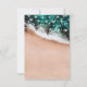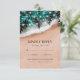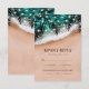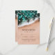 Tarjetas de respuesta de menú de boda de destino de playa con una costa arenosa tropical, olas del océano, hojas de palma románticas, luces de cuerda y una plantilla de RSVP de entrada de comida de boda.