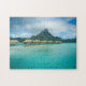 Rompecabezas de un centro turístico de lujo de la casa de planta baja del tejado cubierto con paja del overwater en un centro turístico de vacaciones en la laguna azul clara con una opinión sobre la isla tropical de Bora Bora, cerca de Tahití, en Polinesia francesa.
