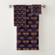 El producto presenta una estampación repetitiva inspirada en un diseño clásico de estilo barroco. El motivo central se asemeja a un estilizado fleur-de-lis o a un elegante plume, representado en tonos dorados, rojos y naranjas vibrantes con efectos de gradiente. El fondo es un azul marino profundo, creando un contraste rico que hace que los elementos de diseño aparezcan. El patrón tiene un toque lujoso y regal, con curvas simétricas y fluidas que le dan un aspecto sofisticado y atemporal.