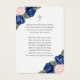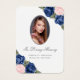 Hermosa tarjeta de memoria floral azul y rosa/tarjeta de oración fúnebre con una foto adornada con rosas color agua rosa y azul y flores del aliento del bebé en un fondo blanco y claro.