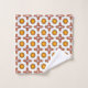 Towel set with a pattern of orange and yellow sunflowers alongside red geometric crosses, hanging on a metal bar; matching washcloth laid flat.