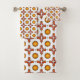 Towel set with a pattern of orange and yellow sunflowers alongside red geometric crosses, hanging on a metal bar; matching washcloth laid flat.