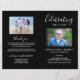 Programa conmemorativo del funeral que incluye en la parte delantera una foto de su ser querido, su nombre, fechas, el lugar de la conmemoración y fecha del evento. En el interior hay un obituario, y orden de servicio; y en el fondo otra foto, una nota de agradecimiento y el segundo lugar para después del funeral. NOTA: Estos vienen como un papel plano de calidad, necesitarás doblarlos tú mismo.