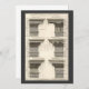 Ilustraciones de época de elementos arquitectónicos antiguos, pentablatures. La entablación consta de tres capas horizontales, todas ellas separadas visualmente entre sí utilizando molduras o bandas. Las tres capas de la entablación tienen nombres distintos: el architrave se encuentra en la parte inferior, el friso en el centro y el cornito moldeado en la parte superior. En el trabajo romano y postrenacentista, la entablación puede ser transportada de columna a columna en forma de arco que brote de la columna que ostenta su peso, conservando sus divisiones y su enriquecimiento escultórico, en su caso. Sólo hay tres originales y antiguos pedidos de arquitectura, el Doric, el Iónico y el Corinthian, que fueron inventados por los griegos. A éstos los romanos añadieron la toscana, que hicieron más simple que la dónica, y el compuesto, que era más ornamental que el corintiano.