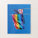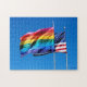 Un puzzle vibrante con una bandera del Orgullo Iris ondulante junto con una bandera estadounidense, colocado contra un cielo azul perfecto. Celebrando un Estados Unidos acogedor y diverso. Fotografiado en Cherry Grove en Fire Island. Parte de la colección Orgullo.