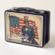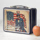 Una figura alocada pero orgullosa se para delante de una bandera de los Estados Unidos destrozada: su presencia es un tributo al espíritu perdurable de libertad, resiliencia y el sueño americano. Esta imagen captura la esencia del Día de la Independencia con dignidad poética y fuerza patriótica.
