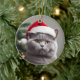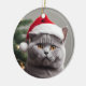 Un gatito de pelo corto británico azul/gris con un sombrero de Santa.