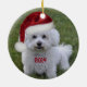 Un regalo perfecto para cualquier perro o amante de Bichon. Esto es un ornamento de cerámica redondo con una foto de un Bichon que lleva un gorra rojo de Santa.