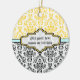 Patrón de Damasco adorno de personalizado de aqua amarillo blanco negro. La parte superior es de color amarillo y blanco y la parte inferior es de color blanco y negro. Una raya acuática separa las dos partes. El texto se escribe en una etiqueta elegante con un contorno blanco y amarillo. Un gran placer para ocasiones especiales bodas, cumpleaños, aniversarios.