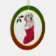 Arte único y divertido del labrador retriever pintado por Naomi Ochiai de Japón. Perrito amarillo adorable del laboratorio que sonríe en la bota de Santa. Un diseño tan delicioso del labrador retriever del navidad. Insértele conocido en el lado trasero