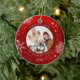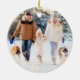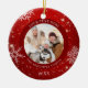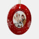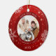 Crea un adorno de fotos festivo y moderno de keepsake en rojo con copos de nieve blancos y personalizado con un título personalizado, foto y nombres y un año al frente y una foto de sangre completa en la parte trasera. Póngase en contacto con el diseñador a través de Zazzle Chat o makeitaboutyoustore@gmail.com si desea modificar este diseño o en otro producto.
