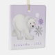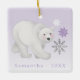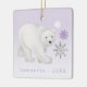 Conmemoren a sus Navidades con este adorable oso polar morado y adorno personalizado con copos de nieve. ¡Este adorno es totalmente personalizable! Puede editar el texto y añadir su propia foto haciendo clic en "personalizar esta plantilla". Este ornamento de oso polar morado personalizado presenta un oso polar dibujado a mano por OhMyStarling y copos de nieve morados, blancos y plateados. Hay un lugar para añadir tu nombre y el año. Hay un patrón de fondo de copos de nieve ligeros púrpura, blancos y purpurinas plateados. Este adorno personalizado de copo de nieve es genial para tu bebé recién nacido, la primera Navidad del bebé, y para los niños!