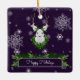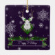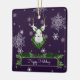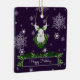 Decore su árbol esta temporada de vacaciones con un adorno de cerámica de reno púrpura. El diseño ornamental incluye un reno festivo con una corona de Navidades adornada con bayas y copos de nieve que caen y una caja de saludo de vacaciones decorada con guirnaldas de vacaciones. También hay artículos de regalo y de vacaciones disponibles con este diseño.