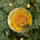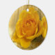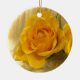 Este adorable adorno vacacional presenta una composición de vida muerta de una exquisita rosa amarilla sobre un fondo beige. Los pétalos varían en color desde amarillo pálido hasta oro hasta un naranja profundo.
