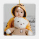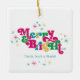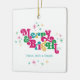 Estos adornos de cerámica cuadrada de 2,75" x 2,75" presentan un saludo retro brillante y colorido, "Merry & Bright", en magenta, verde, azul y oro con marcadores de posición para el nombre o apellidos y el año. ¡Añade tu foto favorita en la parte de atrás!