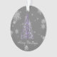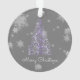 Decore su árbol esta temporada de vacaciones con un árbol de Navidad morado y un adorno de copas de nieve. El diseño ornamental incluye un vibrante árbol de Navidad artístico con copos de nieve en caída y un fondo gris oscuro. También hay artículos de regalo y de vacaciones disponibles con este diseño.