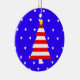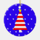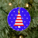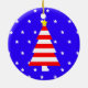 Este adorno navideño patriotico americano presenta un fondo azul con estrellas blancas y un árbol navideño de rayas rojas y blancas. ¡Una gran manera de mostrar tu espíritu patriótico americano en el árbol de Navidad! Ornamentos de derechos de autor de Henis