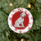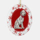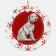 En la parte delantera de este adorno navideño hay una hermosa imagen acuarela de un cachorro dálmata con un collarín rojo brillante. La imagen se coloca sobre un círculo rojo enmarcado por un patrón retro de copo de nieve rojo sobre un fondo blanco. La parte posterior del adorno tiene el mismo fondo y círculo con el texto personalizado en blanco. Muy bien, especialmente para alguien que ama un Dal.