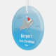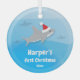 El primer ornamento navideño de un bebé que tiene un tiburón lindo, en un sombrero de Santa, nadando en el océano azul. Simplemente agregue el nombre de su bebé y el año, añada este ornamento a su carrito y luego disfrute en su árbol.