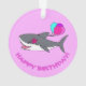 Ornamento con tiburón adorable con flores rosadas sosteniendo globos fiestas en colores rosa, violeta y turquesa. El texto dice "¡Feliz cumpleaños!" El diseño es personalizable y usted puede personalizar el texto.