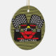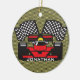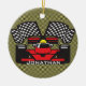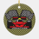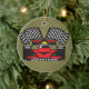Ornamento de diseño de coches de carreras en un fondo a cuadros (se puede personalizar el color del acento) y texto de personalizable en el frente y en la parte posterior.