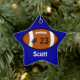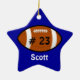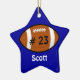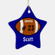 Ornamento navideño de fútbol personalizado hecho en forma de estrella azul, con nombre en blanco y número jersey en negro sobre un ícono de fútbol. Personalice el nombre o el texto según sus necesidades. Es un adorno agradable para los niños o para su jugador estrella de fútbol.
