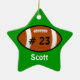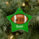 Ornamento navideño personalizado de fútbol hecho en forma de estrella verde, con nombre en blanco y número jersey en negro sobre un ícono de fútbol. Personalice el nombre o el texto según sus necesidades. Es un adorno agradable para los niños o para su jugador estrella de fútbol.