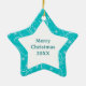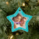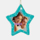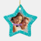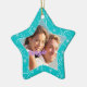 La parte delantera de este adorno navideño en forma de estrella festiva tiene su fotografía enmarcada en un patrón giratorio de bonito azul y blanco. El otro lado del ornamento sostiene el texto personalizado en turquesa más oscuro sobre una estrella blanca bordeada por el mismo patrón de giro acuático. Es fácil reemplazar la foto de muestra por la suya; utilice el personalizar para mover la foto a la mejor posición para la forma de estrella. **Agradecimiento especial a Dana Conditt por el uso de sus obras de arte en este diseño.**