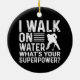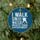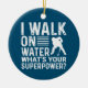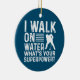 El himno del jugador de hockey con un dicho humorístico incluye texto blanco sobre fondo azul y un jugador de hockey sobre silueta blanca. El texto de este ornamento de hockey dice Camino por el agua ¿Cuál es tu superpotencia?