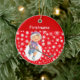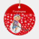 Ofrezca a su jugador de hockey infantil un adorable ornamento de hockey personalizado para el árbol de Navidad Diseño frontal: nieve blanca sobre fondo rojo + jugador de hockey para niños + personaliza con el nombre del jugador de hockey sobre rojo Diseño de espalda: nieve blanca sobre fondo rojo + Feliz Navidad + Par de patines de hockey para niños