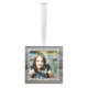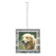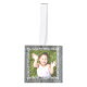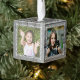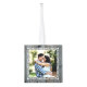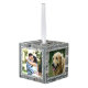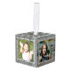 Cubo de madera adorno de Navidad con cuatro plantillas de fotos. Añada una foto a cada lado sobre un fondo rústico de diseño de madera gris. Su foto vertical u horizontal se ajustará a la plantilla cuadrada y se recortará automáticamente. Un marco blanco y floreciente decora cada lado. Personaliza con texto en la parte superior (apellido) y la fecha del año en la parte inferior. Este divertido ornamento de madera hace un gran regalo para la familia o los abuelos.