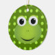 ¡Este ornamento de la rana es perfecto para cualquier amante de la rana! Ofrece un diseño de una rana verde linda del dibujo animado con una sonrisa grande. La rana está en un fondo verde oscuro con los lunares verdes claros.