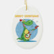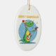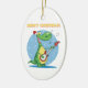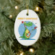 Este ornamento de cerámica oval tiene una imagen de un dinosaurio que toca una guitarra en la nieve. Él está llevando un gorra lindo de santa. Las Felices Navidad se escriben en el top. ¡Esto haría un regalo de la diversión a un niño pequeño, o usted podría guardarlo para su propio árbol de navidad!