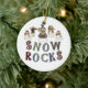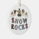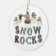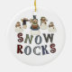 Varios hombres de nieve y un ángel de nieve con un texto que dice "Rocas de nieve" en un adorno de sake de vacaciones de hombre de nieve ¡seguro que te encantará!