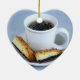 Granos de café asados en plato en forma de corazón azul y blanco del postre con una margarita en la parte delantera, más una taza de Java con biscotti en el lado trasero.