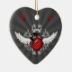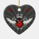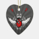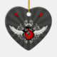 Personalizable en forma de corazón adorno cerámico con guitarras de rock eléctrico cruzadas, alas y florales de vintage sobre rojo, blanco y negro. Puede personalizarlo con texto personalizado o cambiar la forma ornamental y el color de fondo.