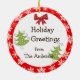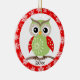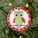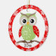El búho está en cuerpo ligero de la verde lima con las alas rojas punteadas beige. El fondo es blanco con el marco rojo con los copos de nieve. La parte posterior del ornamento tiene el mismo marco rojo con una cinta roja y 2 árboles stylized. Los textos están en marrón y adaptable.