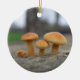 Este adorno de bonito cuenta con una bella fotografía detallada de 4 pequeñas taburetes amarillos que emergen de un tronco en un parque. El fondo está difuminado y los hongos son fotografiados a nivel para que veas el mundo desde su perspectiva.