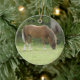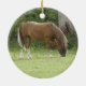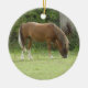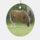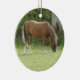 Este adorno adorable de estilo pendant cuenta con una hermosa fotografía de un hermoso caballo marrón de color castaño con una mugre y pies blancos. El caballo está pastoreando en una hierba verde corta en un campo.