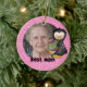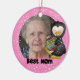 Un fondo rosado con copos de nieve blancos, un pingüino, un texto que dice "Mejor Mamá", y un área donde puedes agregar tu foto favorita así como personalizar el adorno con una cita u otro texto en un adorno de bigote de pingüino mejor mamá ¡que es demasiado lindo!