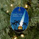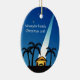 Blue Modern Nativity Christmas Ornament personalizado con tu nombre o titular. El cielo azul y negro nocturno está iluminado por la escena del pesebre con el bebé Jesús, palmeras y estrellas en el cielo. Gran adorno religioso cristiano.