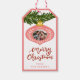 Este vintage diseño de adorno navideño trae todas esas buenas vibraciones nostálgicas de los tiempos pasados. La parte delantera de esta etiqueta de regalo tiene un adorno de vidrio de color rosa que se ata a una rama con una proa rosa que coordina. Hay un lugar en el centro del adorno para añadir tu foto favorita. La parte posterior de la tarjeta tiene un patrón coordinado de color rosa y rojo. Hay un saludo rojo de Feliz Navidad en un estilo con letras a mano y abajo hay un lugar para personalizar con tu nombre.